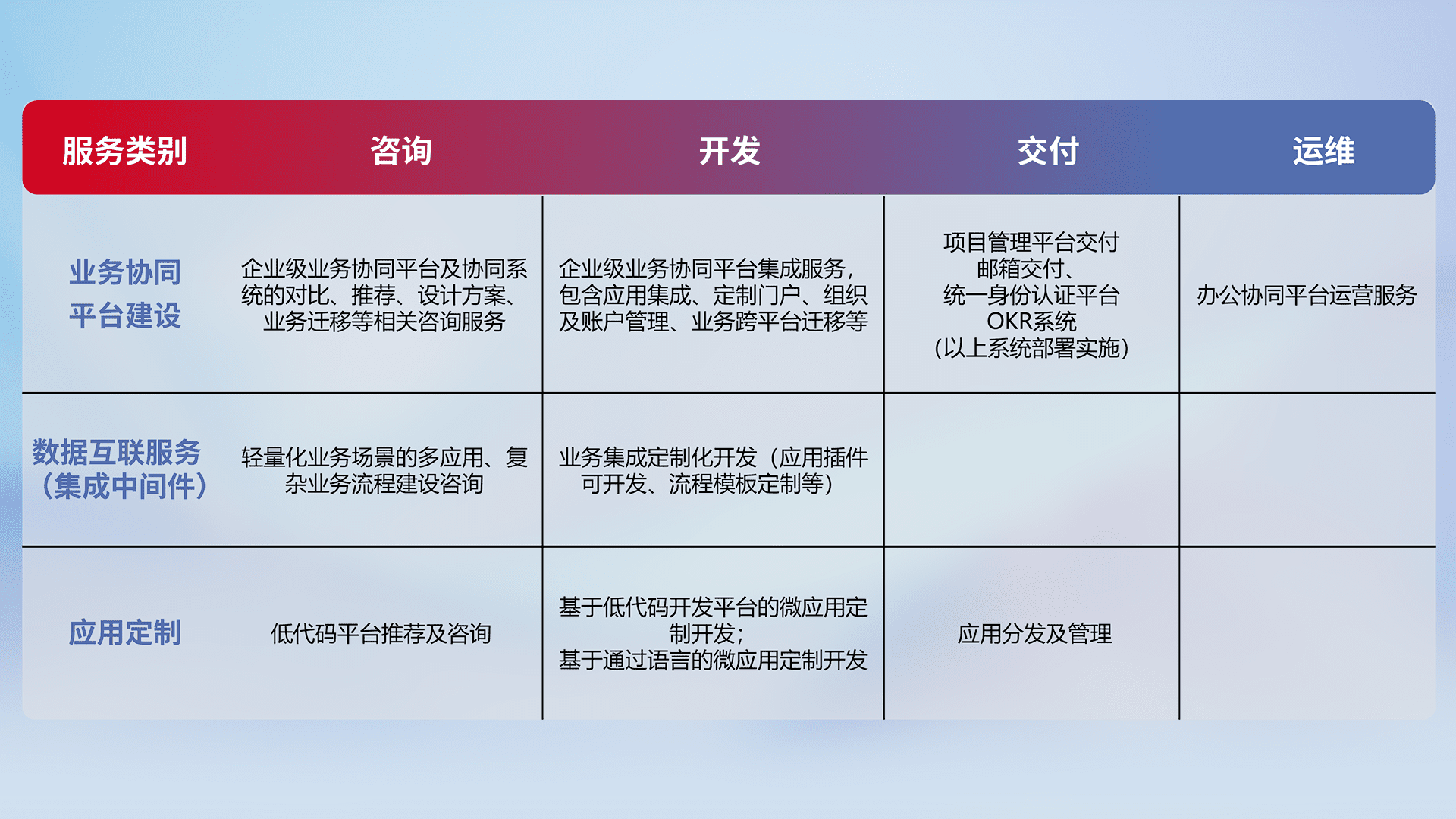 针对钉钉、、、企微、、、、IDaas等平台级产品提供产品的规划、、、、方案、、、交付、、、、定制化开发等服务,,,,实现如统一协同办公、、、智能客户服务、、混合会议管理、、、智能数据查询、、等业务场景,,,实现数字化转型。。