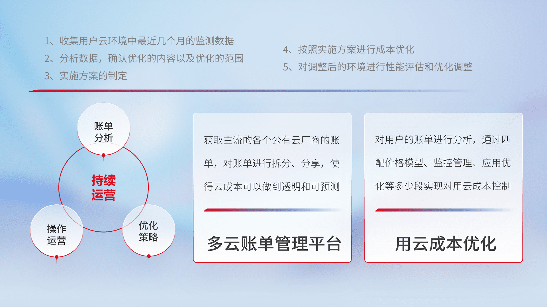 通过多云纳管,,,以统一的资源数据模型把客户的云资源进行抽象和封装,,,,进而实现对多云资源的统一操作,,,,保障云资源管理的可靠性、、、、稳定性与可用性。。。量身定制化运维内容,,配置、、、开发运维、、补丁管理、、、备份、、监控、、认证和访问管理、、、、审计和日常巡检等,,,,保障在用云过程中的可靠度,,,稳定度以及高可用率。。。。