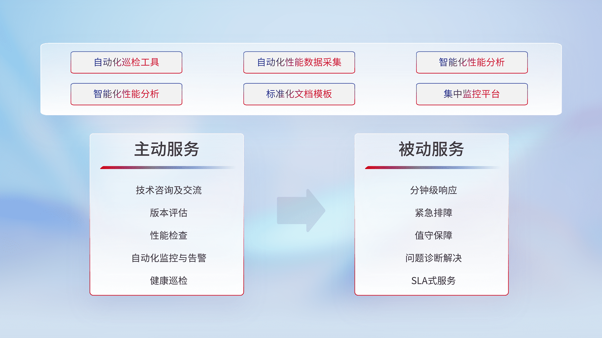 智能化工具和标准化文档,,,保障服务质量,,提供主动服务(包含技术咨询、、、、版本评估、、、性能检查、、、自动化监控与告警、、、、健康巡检)和被动服务包含(分钟级响应、、紧急排障、、、、值守保障、、、问题诊断解决、、、、SLA服务)。。。。