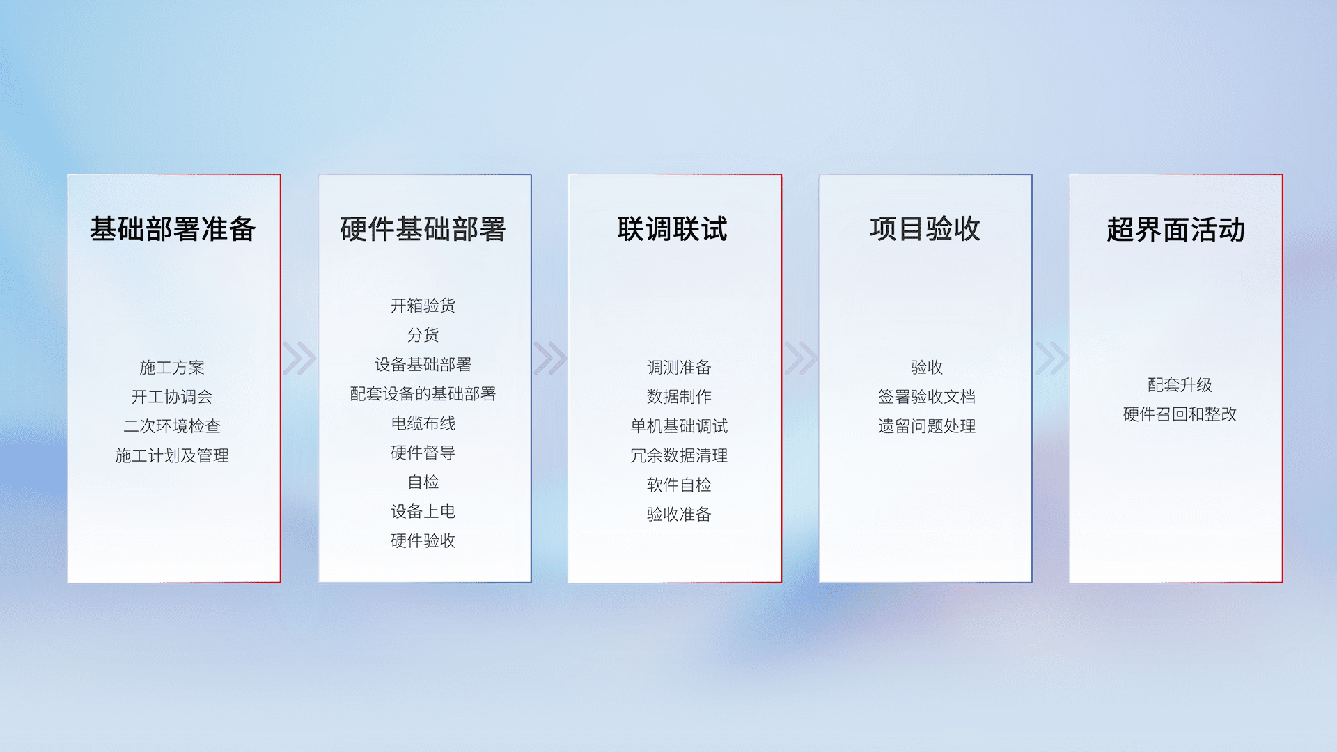 从基础部署准备、、硬件基础部署、、、、联调联试、、、、项目验收、、越界面活动的全过程可追溯,,,,保证施工质量和进度。。
